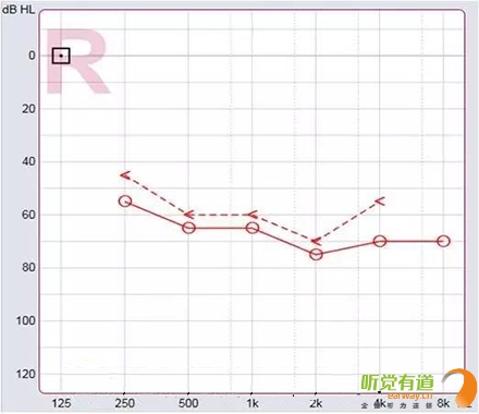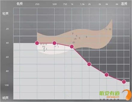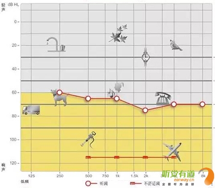 <span style="font-size:16px;"> 純音測試聽力圖的橫坐標為頻率,從左至右表示測試聲的頻率從低到高,即125Hz至8000Hz;縱坐標為強度,從上至下表示受試者能聽到的最小的聲音強度,以dBHL為單位。如下圖所示:</span></p><center><span style="font-size:16px;"><img alt="" src="/upfiles/201810080127399978.png" width="440" height="400" /></span></center><p></p><p><span style="font-size:16px;"> 聽力圖的畫法自從1943年在C.C.Bunch的著作中出現(xiàn)后,至今沒有改變。通常右耳的測試結果用紅色表示,左耳用藍色。下圖是ASHA(1990)建議使用的各種標記符號,這些符號已在世界各地廣泛使用。</span></p><center><span style="font-size:16px;"><img alt="" src="/upfiles/201810080127444763.png" width="440" height="250" /></span></center><p></p><p><span style="font-size:16px;"> 純音測試的測試項目有氣導、骨導、舒適閾與不舒適閾。那么這簡簡單單的聽力圖在驗配過程中有哪些重要作用呢?</span></p><p><span style="font-size:16px;"> 1、確定聽力損失程度</span></p><p><span style="font-size:16px;"> 按照世界衛(wèi)生組織(WHO)1997年的標準,根據(jù)0.5kHz、1kHz、2kHz、和4kHz氣導平均聽閾值,將聽力損失分為輕度、中度、重度和極重度。</span></p><center><span style="font-size:16px;"><img alt="" src="/upfiles/20181008012749435.png" width="440" height="180" /></span></center><p></p><p style="text-align: center;"><span style="font-size:16px;color:#999999;">世界衛(wèi)生組織(WHO-1997)的聽力障礙分級標準</span></p><p style="text-align: left;"><span style="font-size:16px;"> 下圖為某一聽力損失者所測得的聽力圖</span></p><center><span style="font-size:16px;"><img alt="" src="/upfiles/201810080127552977.png" width="440" height="380" /></span></center><p></p><p><span style="font-size:16px;"> 0.5kHz的聽閾為65dBHL,1kHz的聽閾為65dBHL,2kHz的聽閾為75dBHL,4kHz的聽閾為70dBHL。則平均聽閾為(65+65+75+70)/4=68.75。將68.75dBHL代入以上分級表格,得到該聽力損失者的損失程度為重度。 聽力損失程度的確定有利于確定助聽器的功率。</span></p><p><span style="font-size:16px;"> 2、判斷聽力損失性質(zhì)</span></p><p><span style="font-size:16px;"> 根據(jù)氣導、骨導的關系,可將聽力損失分為傳導性聽力損失、感音神經(jīng)性聽力損失及混合性聽力損失。</span></p><p><span style="font-size:16px;"> 骨導與氣導之差大于10dB,且骨導在正常范圍內(nèi)為傳導性聽力損失,表明聽力下降是由外耳、中耳病變引起。</span></p><p><span style="font-size:16px;"> 氣骨導一致(≤10dB)且都在正常范圍之外為感音神經(jīng)性聽力損失。表明聽力下降是由耳蝸、聽神經(jīng)損傷引起。</span></p><p><span style="font-size:16px;"> 骨導與氣導之差大于10dB,但骨導在正常范圍之外為混合性聽力損失,表明以上兩種聽力損失均有,由上述多種部位病變引起聽力下降。確定聽力損失性質(zhì)還需結合臨床表現(xiàn),也有助于助聽器佩戴效果的預測。</span></p><p><span style="font-size:16px;"> 3、解釋聽力損失者的日常生活困難</span></p><p><span style="font-size:16px;"> 聽力損失者在日常生活中經(jīng)常遇到的問題有1)時而聽得到,時而聽不到;2)聽得到,聽不清;3)小聲聽不到,大聲受不了。</span></p><p><span style="font-size:16px;"> 時而聽得到時而聽不到</span></p><p><span style="font-size:16px;"> 以下圖平坦型聽力曲線為例,當周圍言語聲高于其聽閾,即處于曲線下方區(qū)域時,該聽力損失者能聽到;當周圍言語聲低于其聽閾,即處于曲線上方區(qū)域時,聽力損失者則聽不到對方的說話聲。此為“時而聽得到,時而聽不到”。</span></p><center><span style="font-size:16px;"><img alt="" src="/upfiles/201810080128042378.png" width="440" height="340" /></span></center><p></p><p><span style="font-size:16px;"> 聽得到 聽不清</span></p><p><span style="font-size:16px;"> 中文漢語元音輔音的頻率及響度有其分布圖,如下圖所示。以陡降型聽力曲線為例,該聽力損失者聽不到大部分的輔音。聽得清不清楚,主要取決于高頻輔音聽得到聽不到。例如該聽力損失者“g”、“ch”聽不到,但“u”能聽到,因此,他會將“姑姑”、“出租”都聽成“uu”。聽不清楚時,再結合口型,前后句的冗余度猜測。猜對則談話繼續(xù),猜錯則打岔。兒童聽力曲線若是如此,長期接收不正確的語音,會出現(xiàn)口齒不清。</span></p><center><span style="font-size:16px;"><img alt="" src="/upfiles/201810080128148209.png" width="440" height="340" /></span></center><p></p><p><span style="font-size:16px;"> 小聲聽不到 大聲受不了</span></p><p><span style="font-size:16px;"> 小聲聽不到,大聲受不了是重振現(xiàn)象。以下圖聽力曲線為例,“飛機”處于不舒適閾附近,聽力損失者對“飛機”的聲音聽著受不了。另外,該聽力損失者聽不到“手表”等聲音。</span></p><center><span style="font-size:16px;"><img alt="" src="/upfiles/201810080128202005.png" width="440" height="385" /></span></center><p></p><p><span style="font-size:16px;"> 為了更好地使聽力損失者家屬明白聽力損失者的困難,目前有較多的工具可以模擬聽力損失狀態(tài)下的溝通與交流。</span></p><center><span style="font-size:16px;"><img alt="" src="/upfiles/201810080128265518.png" width="440" height="370" /></span></center><p></p><p><span style="font-size:16px;"> 比如,在聲音樣本中選擇“餐廳”,并選擇“正常”,可聽到正常聽力者在“餐廳”環(huán)境中聽到的聲音;若選擇“患者”,則可使聽力正常者聽到聽力損失者聽到的聲音,令聽力正常者親身體驗他們所處的“模糊世界”。</spa