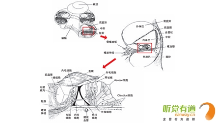 <span style="font-size:16px;"> 內(nèi)耳或稱迷路,分為三個部分:半規(guī)管、前庭和耳蝸,負(fù)責(zé)聽覺的是耳蝸部分,外有骨殼,名骨迷路。耳蝸,顧名思義,像蝸牛殼一樣,耳蝸旋繞2.5~2.75圈。骨迷路的內(nèi)壁被骨性螺旋板分成三部分,這三部分組成了三個錐形管腔(階),外面兩層含有淋巴液,頂部是前庭階,底部是鼓階,中間較小的三角形管腔是中階,又叫膜迷路,其中含有聽神經(jīng)末梢分支。</span></p><p><span style="font-size:16px;"> </span></p><center><span style="font-size:16px;"><img alt="" src="/upfiles/20181116011946651.png" width="440" height="250" /></span></center><p></p><p><span style="font-size:16px;"> 骨迷路(右)</span></p><p><span style="font-size:16px;"> 鐙骨底板在卵圓窗里活動,振動了前庭階的外淋巴液。前庭階和鼓階在蝸孔相匯合,鼓階的另一端是圓窗,正好在卵圓窗和鐙骨底板的下方。中階被薄膜包裹,處于前庭階和鼓階之間,并與它們完全隔離。鐙骨底板在聲波的作用下,推動卵圓窗,使耳蝸內(nèi)的淋巴液產(chǎn)生波動。顳骨很硬,淋巴液的壓力不能使之產(chǎn)生任何活動,因此,當(dāng)鐙骨底板向里推動淋巴液時,淋巴液應(yīng)有一個去處,圓窗部位就是淋巴液流動的方向。中階和前庭階有極薄的膜相隔離,而基底膜分隔中階和鼓階,基底膜是中階里螺旋器的根據(jù)地。中階的外壁由螺旋韌帶和微血管叢組成。血管叢可分泌內(nèi)淋巴液,是內(nèi)淋巴液化學(xué)成分的主要來源,內(nèi)淋巴液是維持毛細(xì)胞功能的必要物質(zhì)。基底膜上有支柱細(xì)胞、內(nèi)毛細(xì)胞、外毛細(xì)胞和膠狀蓋膜等形成的螺旋器,又名Corti’s器。</span></p><p><span style="font-size:16px;"> </span></p><center><span style="font-size:16px;"><img alt="" src="/upfiles/201811160119529073.png" width="440" height="250" /></span></center><p></p><p><span style="font-size:16px;"> 耳蝸截面圖</span></p><p><span style="font-size:16px;"> 毛細(xì)胞是聽覺細(xì)胞,3500個內(nèi)毛細(xì)胞和12000個外毛細(xì)胞很有序的排列著。普遍認(rèn)為是外毛細(xì)胞比內(nèi)毛細(xì)胞敏感35dB,因此更容易被大聲和耳毒藥物損害。蓋膜是一種膠狀物質(zhì),內(nèi)側(cè)附在支持細(xì)胞上,其余部分覆蓋著毛細(xì)胞。毛細(xì)胞上的纖毛叢就埋在蓋膜里。淋巴液的波動或蓋膜的運(yùn)動,可影響到毛細(xì)胞。淋巴液的波動使蓋膜產(chǎn)生猶如鋼琴鍵般的“剪切運(yùn)動”,刺激毛細(xì)胞底部的神經(jīng)末梢,產(chǎn)生神經(jīng)沖動。耳蝸底部,離卵圓窗最近處,對高頻發(fā)生響應(yīng),耳蝸頂部,即遠(yuǎn)離卵圓窗的地方,對低頻發(fā)生響應(yīng),中頻響應(yīng)介于頂和底之間。</span></p><p><span style="font-size:16px;"> 更多詳情請登錄m.vip005.cn</span></p>" />