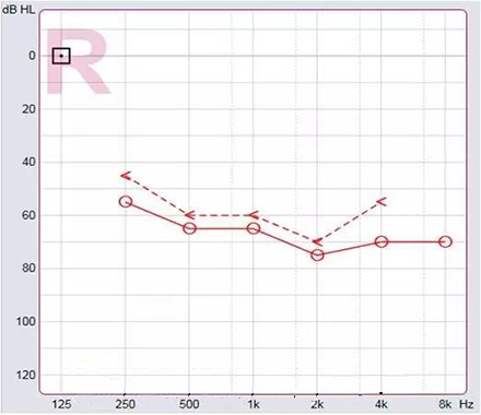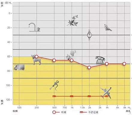 純音測(cè)試聽力圖的橫坐標(biāo)為頻率,從左至右表示測(cè)試聲的頻率從低到高,即125Hz至8000Hz;縱坐標(biāo)為強(qiáng)度,從上至下表示受試者能聽到的最小的聲音強(qiáng)度,以dBHL為單位。如下圖所示:</p><p> </p><center><img alt="" src="/upfiles/201903250213137760.png" width="440" height="400" /></center><p></p><p> 聽力圖的畫法自從1943年在C.C.Bunch的著作中出現(xiàn)后,至今沒有改變。通常右耳的測(cè)試結(jié)果用紅色表示,左耳用藍(lán)色。下圖是ASHA(1990)建議使用的各種標(biāo)記符號(hào),這些符號(hào)已在世界各地廣泛使用。</p><p> </p><center><img alt="" src="/upfiles/201903250213216822.png" width="440" height="250" /></center><p></p><p> 純音測(cè)試的測(cè)試項(xiàng)目有氣導(dǎo)、骨導(dǎo)、舒適閾與不舒適閾。那么這簡(jiǎn)簡(jiǎn)單單的聽力圖在驗(yàn)配過程中有哪些重要作用呢?</p><p> 1、確定聽力損失程度</p><p> 按照世界衛(wèi)生組織(WHO)1997年的標(biāo)準(zhǔn),根據(jù)0.5kHz、1kHz、2kHz、和4kHz氣導(dǎo)平均聽閾值,將聽力損失分為輕度、中度、重度和極重度。</p><p> </p><center><img alt="" src="/upfiles/201903250213312187.png" width="440" height="180" /></center><p></p><p> 世界衛(wèi)生組織(WHO-1997)的聽力障礙分級(jí)標(biāo)準(zhǔn)</p><p> 舉例</p><p> 下圖為某一聽力損失者所測(cè)得的聽力圖</p><p> </p><center><img alt="" src="/upfiles/201903250213367902.png" width="440" height="380" /></center><p></p><p> 0.5kHz的聽閾為65dBHL,1kHz的聽閾為65dBHL,2kHz的聽閾為75dBHL,4kHz的聽閾為70dBHL。則平均聽閾為(65+65+75+70)/4=68.75。將68.75dBHL代入以上分級(jí)表格,得到該聽力損失者的損失程度為重度。 聽力損失程度的確定有利于確定助聽器的功率。</p><p> 2、判斷聽力損失性質(zhì)</p><p> 根據(jù)氣導(dǎo)、骨導(dǎo)的關(guān)系,可將聽力損失分為傳導(dǎo)性聽力損失、感音神經(jīng)性聽力損失及混合性聽力損失。</p><p> 骨導(dǎo)與氣導(dǎo)之差大于10dB,且骨導(dǎo)在正常范圍內(nèi)為傳導(dǎo)性聽力損失,表明聽力下降是由外耳、中耳病變引起。</p><p> 氣骨導(dǎo)一致(≤10dB)且都在正常范圍之外為感音神經(jīng)性聽力損失。表明聽力下降是由耳蝸、聽神經(jīng)損傷引起。</p><p> 骨導(dǎo)與氣導(dǎo)之差大于10dB,但骨導(dǎo)在正常范圍之外為混合性聽力損失,表明以上兩種聽力損失均有,由上述多種部位病變引起聽力下降。確定聽力損失性質(zhì)還需結(jié)合臨床表現(xiàn),也有助于助聽器佩戴效果的預(yù)測(cè)。</p><p> 3、解釋聽力損失者的日常生活困難</p><p> 聽力損失者在日常生活中經(jīng)常遇到的問題有1)時(shí)而聽得到,時(shí)而聽不到;2)聽得到,聽不清;3)小聲聽不到,大聲受不了。</p><p> 時(shí)而聽得到時(shí)而聽不到</p><p> 以下圖平坦型聽力曲線為例,當(dāng)周圍言語聲高于其聽閾,即處于曲線下方區(qū)域時(shí),該聽力損失者能聽到;當(dāng)周圍言語聲低于其聽閾,即處于曲線上方區(qū)域時(shí),聽力損失者則聽不到對(duì)方的說話聲。此為“時(shí)而聽得到,時(shí)而聽不到”。</p><p> </p><center><img alt="" src="/upfiles/201903250213445950.png" width="440" height="340" /></center><p></p><p> 聽得到 聽不清</p><p> 中文漢語元音輔音的頻率及響度有其分布圖,如下圖所示。以陡降型聽力曲線為例,該聽力損失者聽不到大部分的輔音。聽得清不清楚,主要取決于高頻輔音聽得到聽不到。例如該聽力損失者“g”、“ch”聽不到,但“u”能聽到,因此,他會(huì)將“姑姑”、“出租”都聽成“uu”。聽不清楚時(shí),再結(jié)合口型,前后句的冗余度猜測(cè)。猜對(duì)則談話繼續(xù),猜錯(cuò)則打岔。兒童聽力曲線若是如此,長(zhǎng)期接收不正確的語音,會(huì)出現(xiàn)口齒不清。</p><p> </p><center><img alt="" src="/upfiles/201903250213526855.png" width="440" height="340" /></center><p></p><p> 小聲聽不到 大聲受不了</p><p> 小聲聽不到,大聲受不了是重振現(xiàn)象。以下圖聽力曲線為例,“飛機(jī)”處于不舒適閾附近,聽力損失者對(duì)“飛機(jī)”的聲音聽著受不了。另外,該聽力損失者聽不到“手表”等聲音。</p><p> </p><center><img alt="" src="/upfiles/201903250214013300.png" width="440" height="385" /></center><p></p><p> 為了更好地使聽力損失者家屬明白聽力損失者的困難,目前有較多的工具可以模擬聽力損失狀態(tài)下的溝通與交流。</p><p> </p><center><img alt="" src="/upfiles/201903250214075950.png" width="440" height="370" /></center><p></p><p> 比如,在聲音樣本中選擇“餐廳”,并選擇“正常”,可聽到正常聽力者在“餐廳”環(huán)境中聽到的聲音;若選擇“患者”,則可使聽力正常者聽到聽力損失者聽到的聲音,令聽力正常者親身體驗(yàn)他們所處的“模糊世界”。</p><p> 在“典型聽力圖”中,有“輕度”、“中度”、“重度”、“極重度”、“陡降型聽力”等選項(xiàng),若選擇“重度”,則可體驗(yàn)重度聽力損失者所聽到的聲音。</p><p> 4、調(diào)試</p><p> 聽力圖在助聽器驗(yàn)配調(diào)試過程中也起著非常重要的作用。</p><p> 首次驗(yàn)配</p><p> 助聽器處方公式結(jié)合聽力圖計(jì)算出聽力損失者的目標(biāo)增益,為驗(yàn)配師的進(jìn)一步調(diào)節(jié)奠定了基礎(chǔ)。聽力圖結(jié)果越準(zhǔn)確,首次驗(yàn)配的滿意度越高。</p><p> 調(diào)試</p><p> 在助聽器調(diào)試過程中,不能忽視聽力圖的作用。舉一