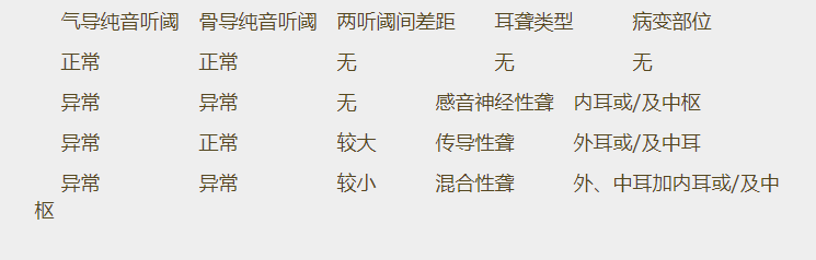 純音聽力檢查結果體現為純音聽力圖。</p><p> 正常情況下我們是通過兩條途徑來感受聲音信號的——氣導途徑和骨導途徑。前者我們非常熟悉,從外耳到中耳到內耳到聽中樞;后者我們或許不太注意:從顱骨直接到內耳到聽中樞。相應地,純音聽力檢查也有兩種聲音剌激方式,氣導輸入和骨導輸入。前者我們天天使用,而后者則很少被我們使用。事實上,兩閾值曲線的異同正是我們判斷聽損病變部位的基礎(見下表)。了解患者病變部位對于獲得他們的信任以及確定助聽器電聲性能都有非同尋常的意義。因此,有條件的時候還是應當重視骨導聽閾測試。</p><p style="text-align: center;"><img src="/upfiles/201906100237368907.png" alt="" /><br /></p><p> 更多詳情請登錄聽覺有道助聽器m.vip005.cn</p>" />