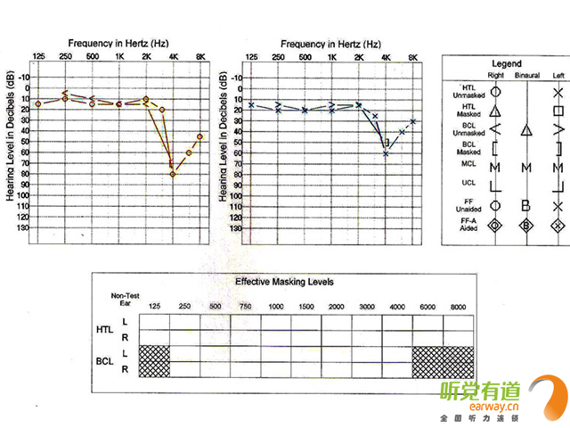 <span style="font-size:16px;"> 首先聽覺有道跟大家解釋一下純音測聽的定義以及臨床意義。純音測聽包括氣導聽閾測試(AC)和骨導聽閾測試(BC),以耳機及骨導振子給聲,反應受試者在安靜環境下能夠聽到的各個頻率的最小聲音的聽力級(氣導頻率范圍125-8000Hz,骨導250-4000Hz)。它是目前能準確反映聽敏度的主觀行為測試方法之一,在臨床上是最基本最重要的聽力檢查方法。</span></p><p><span style="font-size:16px;"><br /></span></p><p style="text-align: center;"><span style="font-size:16px;"><img src="/upfiles/201803010200415958.jpg" align="middle" alt="" /><br /></span></p><p style="text-align: center;"><span style="font-size:16px;"><br /></span></p><p><span style="font-size:16px;"> 先整體看一下聽力圖,它的橫坐標是純音的頻率,縱坐標表示的是聽力級(單位為db HL),從上往下看數字是變大的。0表示聽力零級,簡單地說就是科研人員測了很多聽力正常男女的聽力,以他們能聽到的最小聲音作為聽力零級。所以如果你的聽力是正常的話,聽力圖上的閾值曲線應該在零附近浮動,如果你聽力超常,那就在0以上也就是為負值了。如果你聽力下降,那線就往下走,越往下就說明聽力損失得越多。從生活常識上理解,所謂聽閾聽閾,閾值越低表示你能聽到越小的聲音,聽力就越好,閾值越高,聽力越差。</span></p><p><span style="font-size:16px;"> 接著說一下聽力圖上的圈圈叉叉代表的意思。叉叉表示左耳的氣導聽閾,圈圈表示右耳氣導,開口向左的尖括號表示左耳骨導,開口向右的表示右耳骨導。旁邊的masked表示加掩蔽之后的聽力。</span></p><p><span style="font-size:16px;"> 為什么要加掩蔽呢?舉個例子:你右耳聽力比左耳好,當你左耳給聲強度很大,會出現你左耳其實沒聽見但右耳偷聽到了的情況,這時你就會反應,但是這時你的反應能代表左耳的聽閾嗎?肯定比你實際聽閾要好,所以測聽人員會在你右耳加噪聲,不讓你右耳偷聽左耳的聲音,這樣測出來的左耳聽力稱掩蔽之后的聽閾。左耳掩蔽之后的氣導用小正方形來表示。同理,右耳掩蔽用小三角形表示。骨導也需要掩蔽。左耳掩蔽后骨導用向左的方括號表示,右耳用向右的方括號表示。</span></p><p><span style="font-size:16px;"> 最后我們該如何分析聽力圖。簡單地說,氣導的傳聲路徑包括外中內耳以及神經部分,骨導只包括內耳和神經部分,因此出現骨氣導差則表明聽覺通路上有外中耳病變。考慮到各種誤差因素,一般認為骨氣導相差10db HL屬于正常范圍。根據骨氣導的關系可以將聽力損失分為傳導性聽力損失、感音神經性聽力損失以及混合性聽力損失。骨氣導差大于10,且骨導在正常范圍為傳導性聽損;骨氣導一致且都在正常范圍以外為感音神經性聽損;骨氣導差大于10,骨導在正常范圍之外為混合性聽損。</span></p><p><span style="font-size:16px;"> 當然,如果想進一步定位聽力診斷結果,還需要結合其他的一些測試如聲導抗、ABR、耳蝸電圖、耳聲發射、40Hz、影像學檢查等。</span></p><p><span style="font-size:16px;"> 更多詳情請登錄m.vip005.cn。</span></p>" />