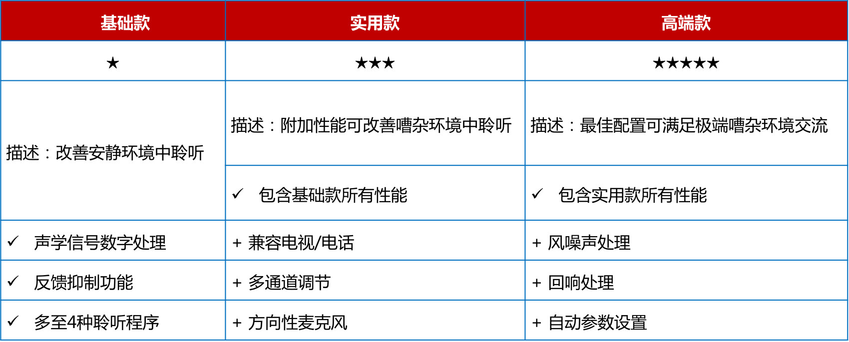 <span style="font-size:16px;"> 助聽器價格取決于機器的檔次,而檔次由內含的技術種類決定。助聽器檔次大致可分為基礎款、實用款、高端款。這三種檔次的區別請參見下表:</span></p><p style="text-align: center;"><span style="font-size:16px;"><img src="/upfiles/201808150226553383.png" width="640" alt="" /><br /></span></p><p><span style="font-size:16px;"> 那么,如何應該選擇哪種檔次的助聽器呢?</span></p><p><span style="font-size:16px;"> 選擇助聽器時主要需要考慮兩大因素。首先要考慮的就是弱聽人士的聽力損失程度,其次要考慮的就是弱聽人士的日常生活方式。比方說,某位弱聽人士是中度聽力損失,日常在家為主,那么實用款檔次助聽器通常可以滿足TA的需求。</span></p><p><span style="font-size:16px;"> 當然,這里只是為助聽器選配提供了大致方向,如何選配仍然需要具體情況具體分析,最好還是需要跟驗配師面對面溝通。</span></p><p><span style="font-size:16px;"> 1、高端款助聽器</span></p><p><span style="font-size:16px;"> 不同廠家的高端款助聽器均代表了各自的尖端技術,并致力于提供最佳的音質。</span></p><p><span style="font-size:16px;"> 這類助聽器高端之處在于自動適應各種聆聽環境,最優化佩戴者的聆聽清晰度和舒適度,讓佩戴者在極度嘈雜的環境中,如咖啡館,也能清晰地聽到同伴的言語聲。常見性能包括:</span></p><p><span style="font-size:16px;"> (1) 多種外觀、顏色可選;</span></p><p><span style="font-size:16px;"> (2) 環境自適應;</span></p><p><span style="font-size:16px;"> (3) 360°信號追蹤;</span></p><p><span style="font-size:16px;"> (4) 兼容各種藍牙設備。</span></p><p><span style="font-size:16px;"> 高端款助聽器為什么能夠自動適應各種聆聽環境呢?這是因為左右兩側的高端款助聽器能夠相互“通電報”,精準判斷所處的聆聽環境并自主學習,給出最佳的助聽設置。</span></p><p><span style="font-size:16px;"> 比如,您經常出入一家書店,每次您進入這家書店時總是習慣性地將音量調低2分貝;長此以往,當您再次進入該書店時,兩臺助聽器將會默契地降低2分貝。</span></p><p><span style="font-size:16px;"> 360°信號追蹤可以幫助佩戴者建立更佳的空間感知,對所處環境有充足的把控和預判,避免一些潛在的危險。而當助聽器連接至各種藍牙設備時,聆聽清晰度會更高,且不會打擾其他人。</span></p><p><span style="font-size:16px;"> 比如家人總是抱怨您把電視機聲音開得太大,拒絕跟您一起觀看電視時,您可以選配能夠兼容電視的助聽器,并進行獨立的音量調節,而家人只需設置為常規音量即可。高端款助聽器的價位一般在15000以上。</span></p><p style="text-align: center;"><span style="font-size:16px;"><img src="/upfiles/201808150228328500.jpg" alt="" /><br /></span></p><p><span style="font-size:16px;"> 2、實用款助聽器</span></p><p><span style="font-size:16px;"> 實用款助聽器的價格一般在8000~15000之間。實用款助聽器包含一定的降噪技術和言語提升功能,可以滿足大多數環境中的聆聽需求。部分廠家的實用款助聽器也可兼容各種藍牙設備。實用款助聽器的突出性能大致包括:</span></p><p><span style="font-size:16px;"> (1) 可連接外接音源;</span></p><p><span style="font-size:16px;"> (2) 言語清晰度提升;</span></p><p><span style="font-size:16px;"> (3) 方向性功能。</span></p><p><span style="font-size:16px;"> 3、基礎款助聽器</span></p><p><span style="font-size:16px;"> 基礎款助聽器的價位一般在8000以下。基礎款助聽器能夠滿足安靜環境中的交流需求,并具備反饋管理功能。反饋管理功能能夠有效提升佩戴舒適度,避免在日常佩戴過程中出現尖銳的干擾聲。</span></p><p><span style="font-size:16px;"> 基礎款助聽器適用于經常在家的弱聽人士,若是生活方式比較豐富多彩的弱聽人士建議選配其他檔次的助聽器。實用款助聽器的突出性能大致包括:</span></p><p><span style="font-size:16px;"> (1) 數字信號處理技術;</span></p><p><span style="font-size:16px;"> (2) 反饋管理功能;</span></p><p><span style="font-size:16px;"> (3) 多種聆聽程序可選。</span></p><p><span style="font-size:16px;"> 更多詳情請登錄m.vip005.cn。</span></p>" />