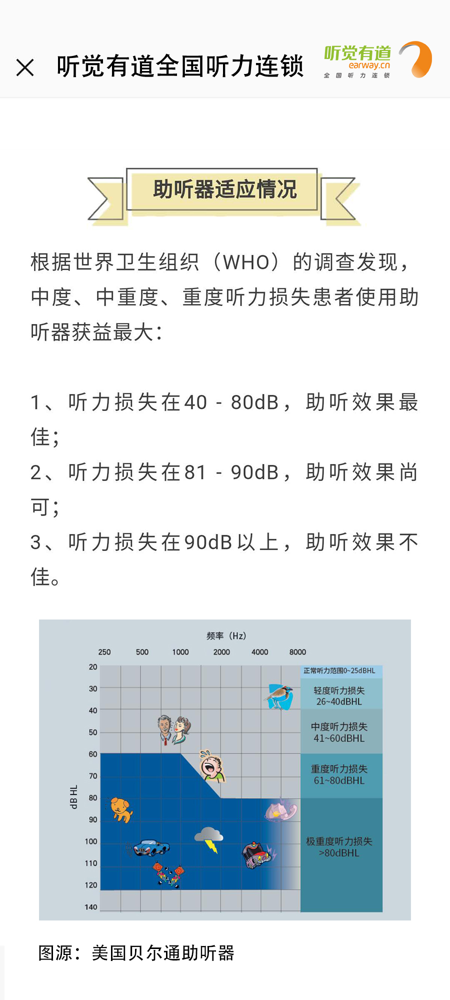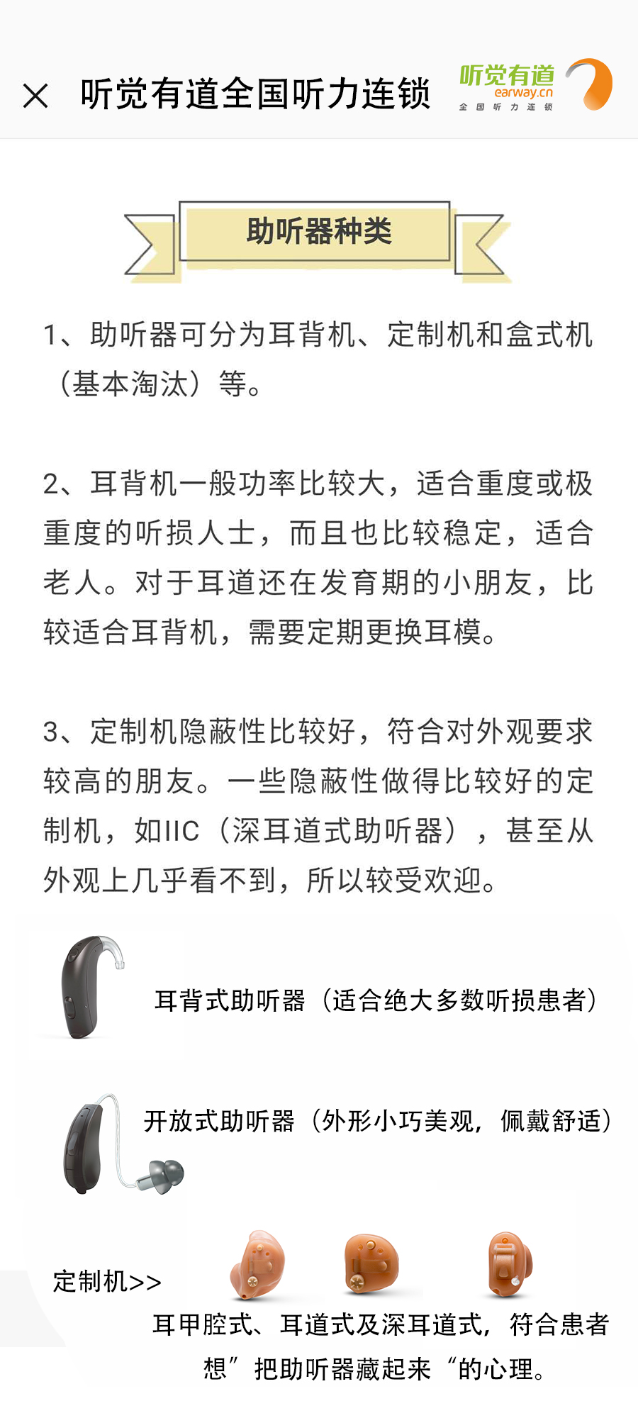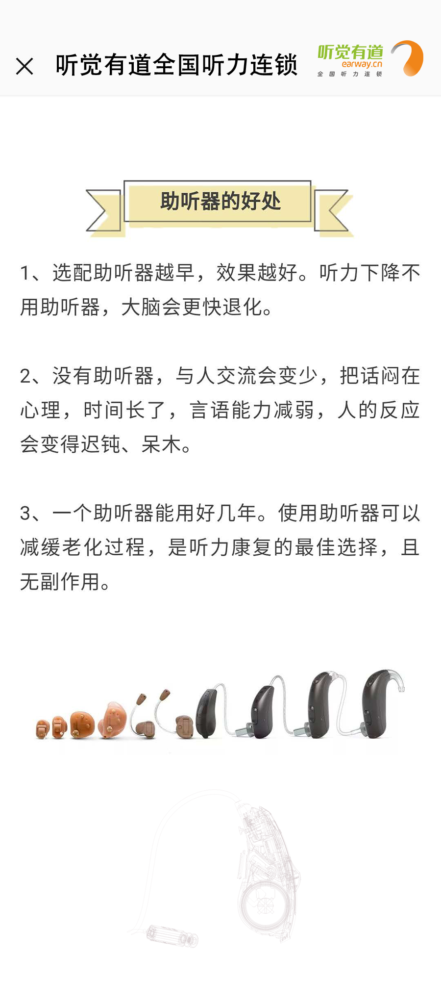 什么是助聽器?長什么樣子?有什么作用?如何使用?這里一一告訴您!</p><p> 助聽器是聽力障礙者使用的輔具,用來補足聽力損傷所造成的缺陷。廣義上講凡能有效地把聲音傳入耳朵的各種裝置都可以看作為助聽器,狹義上講助聽器是一個電聲放大器,通過它將聲音放大,使聽障者聽到了原來聽不清楚、聽不到的聲音。</p><p> 第一:助聽器的種類</p><p style="text-align: center;"><img src="/upfiles/201901180318143583.jpg" width="640" alt="" /><br /></p><p> 第二:助聽器的好處</p><p style="text-align: center;"><img src="/upfiles/201901180318334139.png" width="640" alt="" /><br /></p><p> 第三:如何適應助聽器</p><p style="text-align: center;"><img src="/upfiles/201901180318506440.jpg" width="640" alt="" /><br /></p><p> 第四:選配助聽器流程</p><p style="text-align: center;"><img src="/upfiles/201901180319039646.jpg" width="640" alt="" /><br /></p><p style="text-align: center;"><br /></p><p> 更多詳情請登錄m.vip005.cn</p>" />