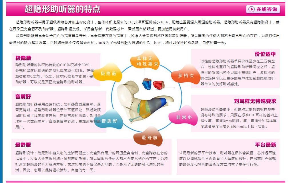 <span style="font-size:16px;"> 真正意義上的隱形助聽器應(yīng)該是invisible in canal,也就是IIC。IIC采用了更先進的芯片和設(shè)計,體積比原來的深耳道式助聽器(CIC)還要小20%以上,放置位置是在耳道的深處。</span></p><p><span style="font-size:16px;"> 需要注意,隱形助聽器戴在耳朵,在外面看是完全看不到助聽器的,不會被人發(fā)現(xiàn)有在佩戴助聽器,而且音質(zhì)、安全性、便攜性等各方面也做得非常好,特別適合對外形和性能上有高要求的用戶。</span></p><p><span style="font-size:16px;"> 隱形助聽器的選配須知</span></p><p><span style="font-size:16px;"> 1、隱蔽性極高</span></p><p><span style="font-size:16px;"> 目前最小的助聽器機型,無論從體積還是外殼厚度上,都比其他助聽器要小很多,從外面觀察基本完全看不到機身,做到真正意義上的“隱形”。</span></p><p><span style="font-size:16px;"> 2、舒適清晰</span></p><p><span style="font-size:16px;"> 位于外耳道深處,更接近耳膜,保留了耳廓收集聲音、聲源定位的功能,采用新一代的高科技芯片,晶體管數(shù)量、芯片運轉(zhuǎn)速度都性能極好,音質(zhì)舒適自然,聽起來更清晰。</span></p><p><span style="font-size:16px;"> 3、高端機型</span></p><p><span style="font-size:16px;"> 外形和性能近乎完美結(jié)合,“隱形”的特性極為迷人。隱形助聽器屬于高端機型,一般價格都不會低,至少上萬元,不過其帶來的美好聆聽感受是無與倫比的。</span></p><p><span style="font-size:16px;"> 4、對耳樣無特殊要求</span></p><p><span style="font-size:16px;"> 對定制機的取樣無特殊要求,只要在標準CIC耳樣的基礎(chǔ)上超過第二彎道3mm即可。第二彎道處的耳樣厚度或?qū)挾戎灰_到6mm以上即可。</span></p><p><span style="font-size:16px;"> </span></p><center><img src="/upfiles/201712130407572536.jpg" alt="" /><br /></center>" />